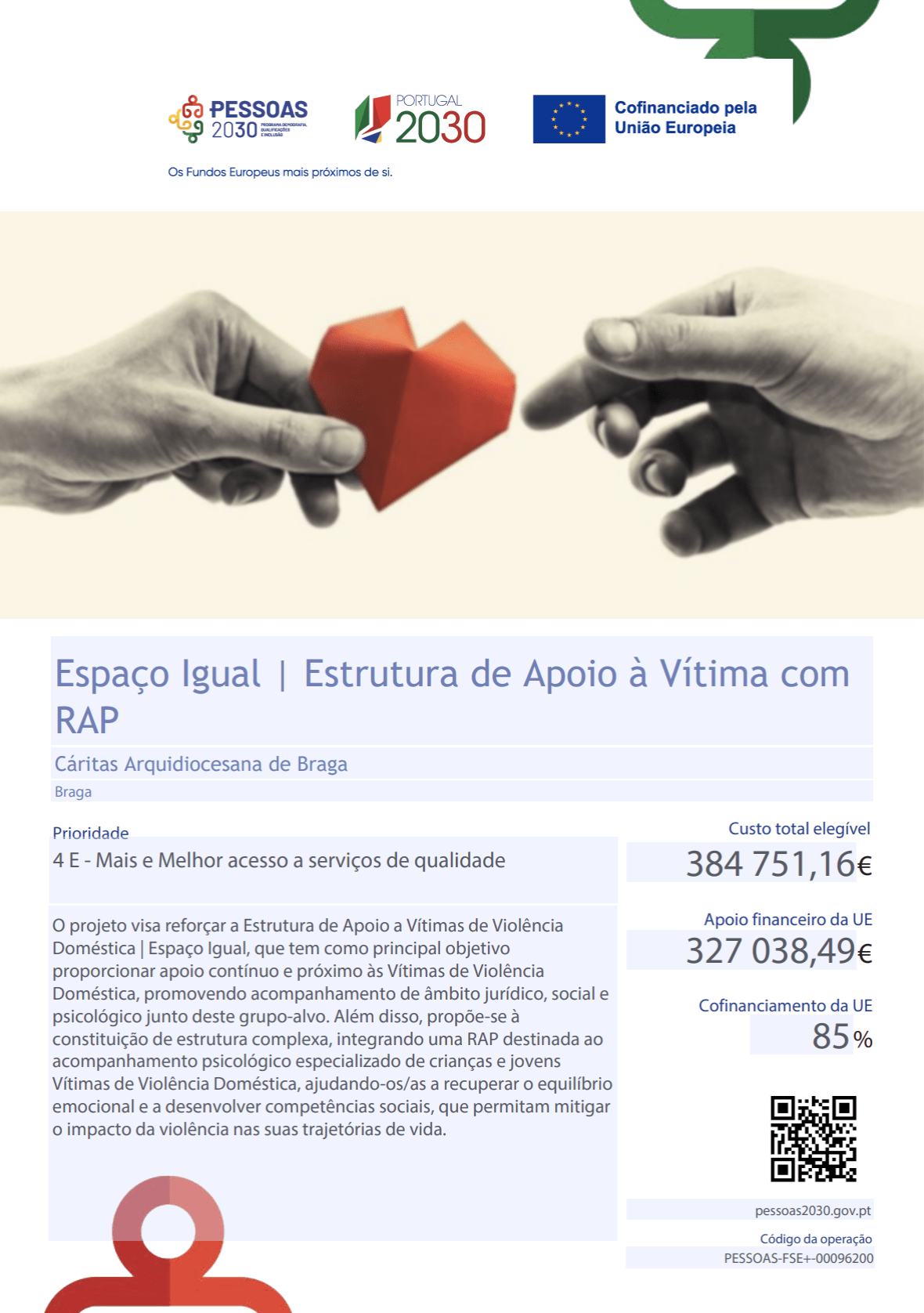 Em abril de 2024, no âmbito do Programa Pessoas 2030, a Cáritas de Braga reforçou a Resposta de Apoio Psicológico para Crianças e Jovens Vítimas de Violência Doméstica (RAP), integrada no Espaço Igual. Esta resposta destina-se a crianças e jovens até aos 18 anos, residentes no concelho de Braga, proporcionando apoio psicológico e psicoterapêutico especializado para minimizar os impactos da violência doméstica, evitar a revitimização e garantir a proteção e segurança emocional dos beneficiários.